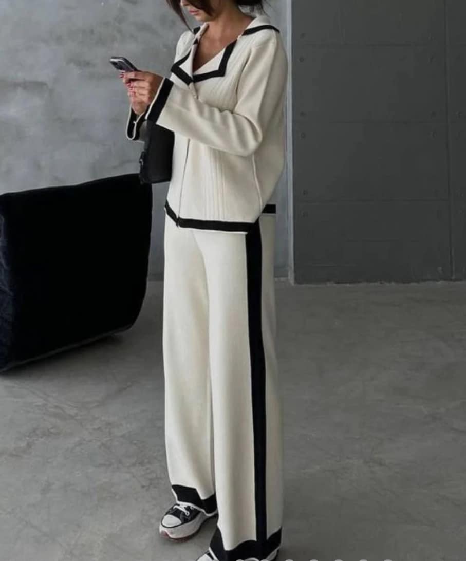 Ensemble en laine Nina, conçu pour allier style et confort. Avec sa coupe chic et ses détails contrastés, il incarne la sophistication moderne.