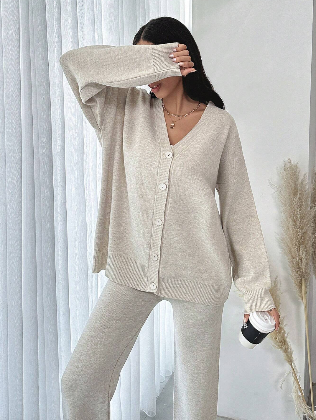 Ensemble composé d’un pantalon fluide à taille élastique et d’un gilet boutonné oversize.
