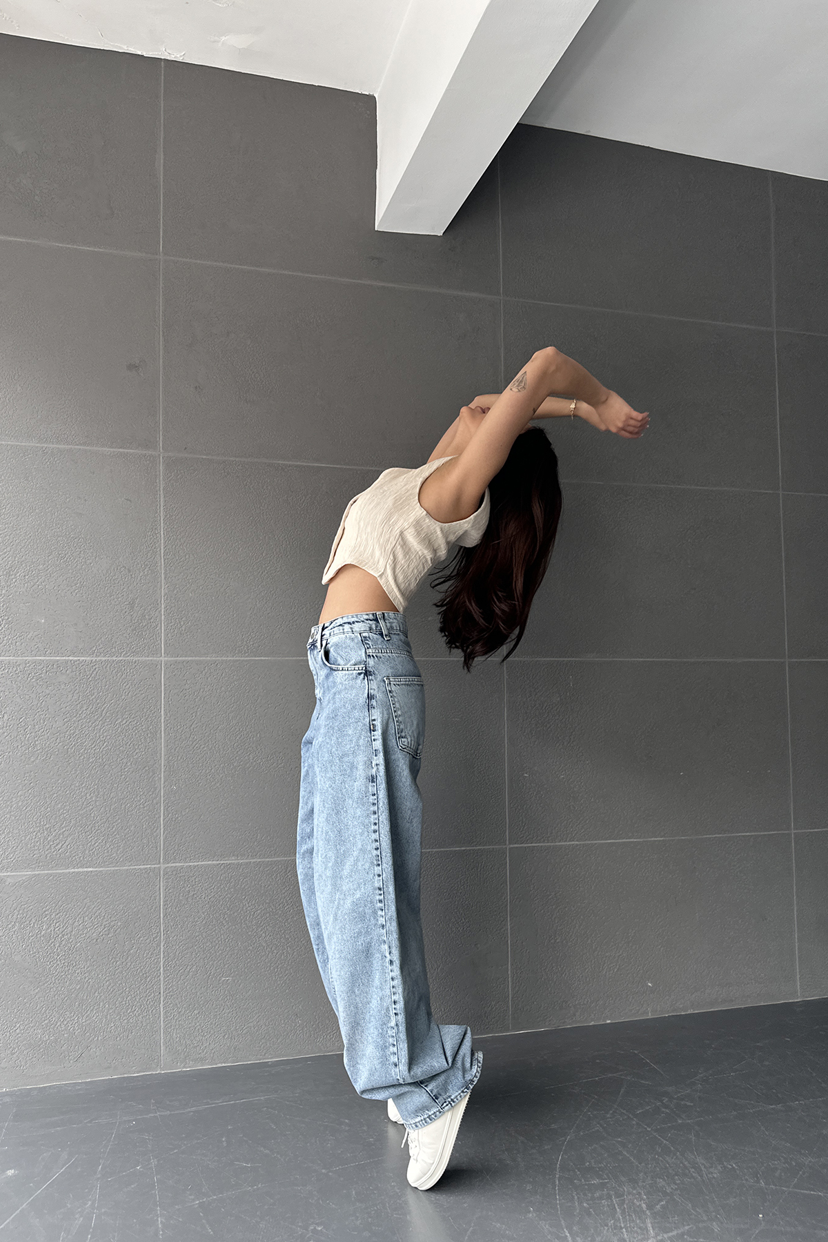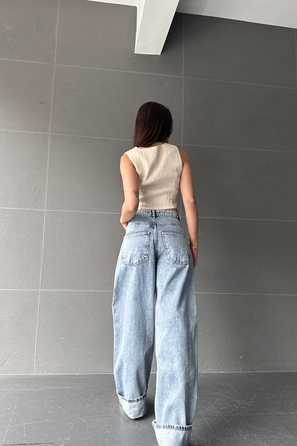 ce jean large à taille haute mixe confort et style avec son denim léger et sa coupe fluide.
