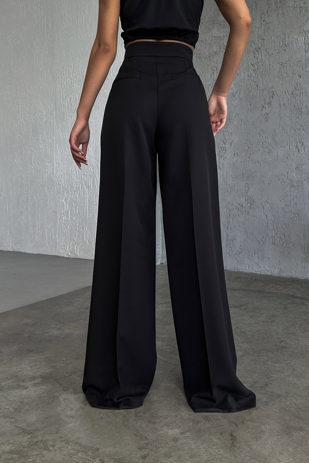 Élégant et structuré, ce pantalon noir à taille haute à sa coupe large allonge la silhouette, en plus des détails à la taille.