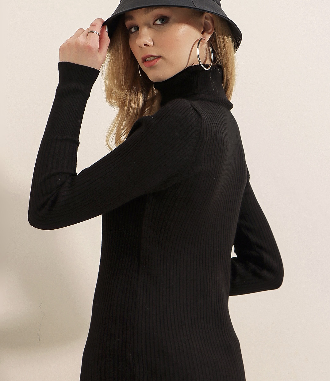 Pull noir à col roulé. Sa maille côtelée offre une coupe près du corps confortable et élégante