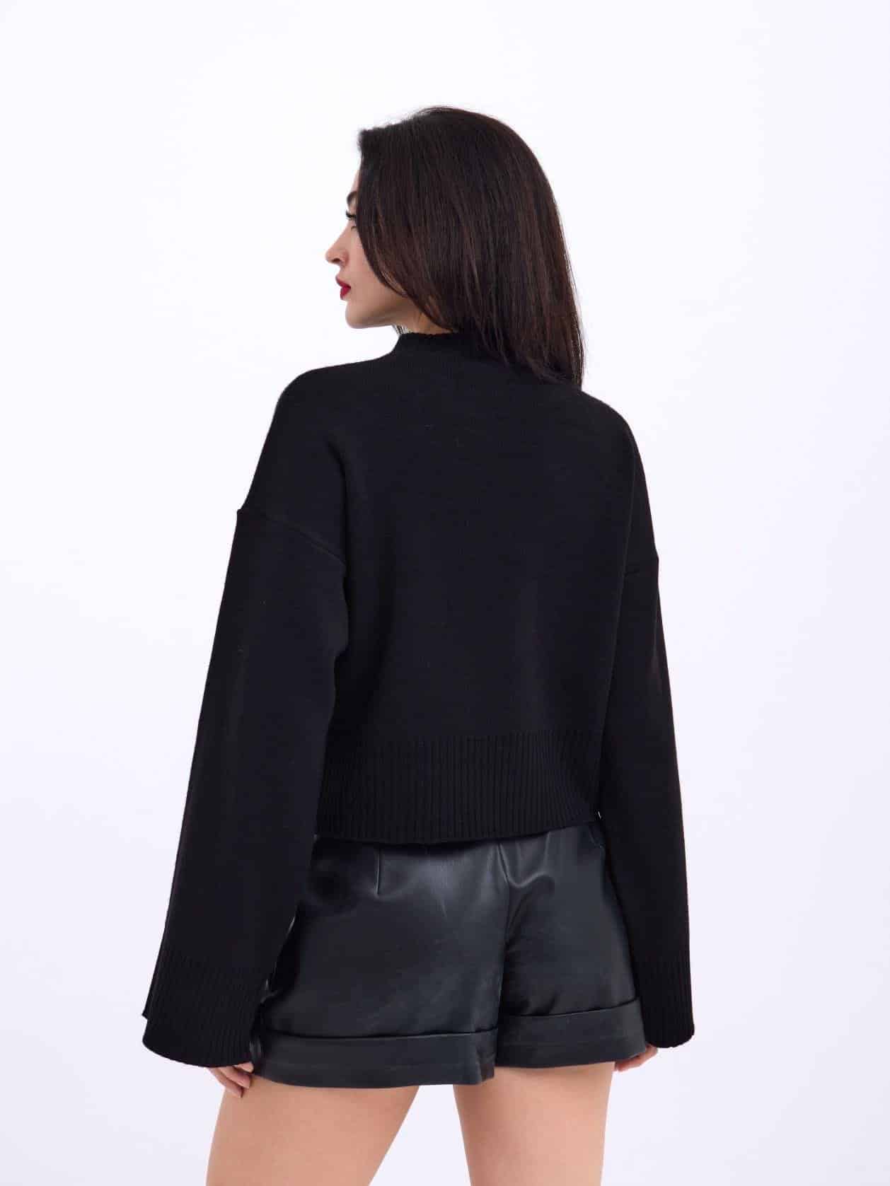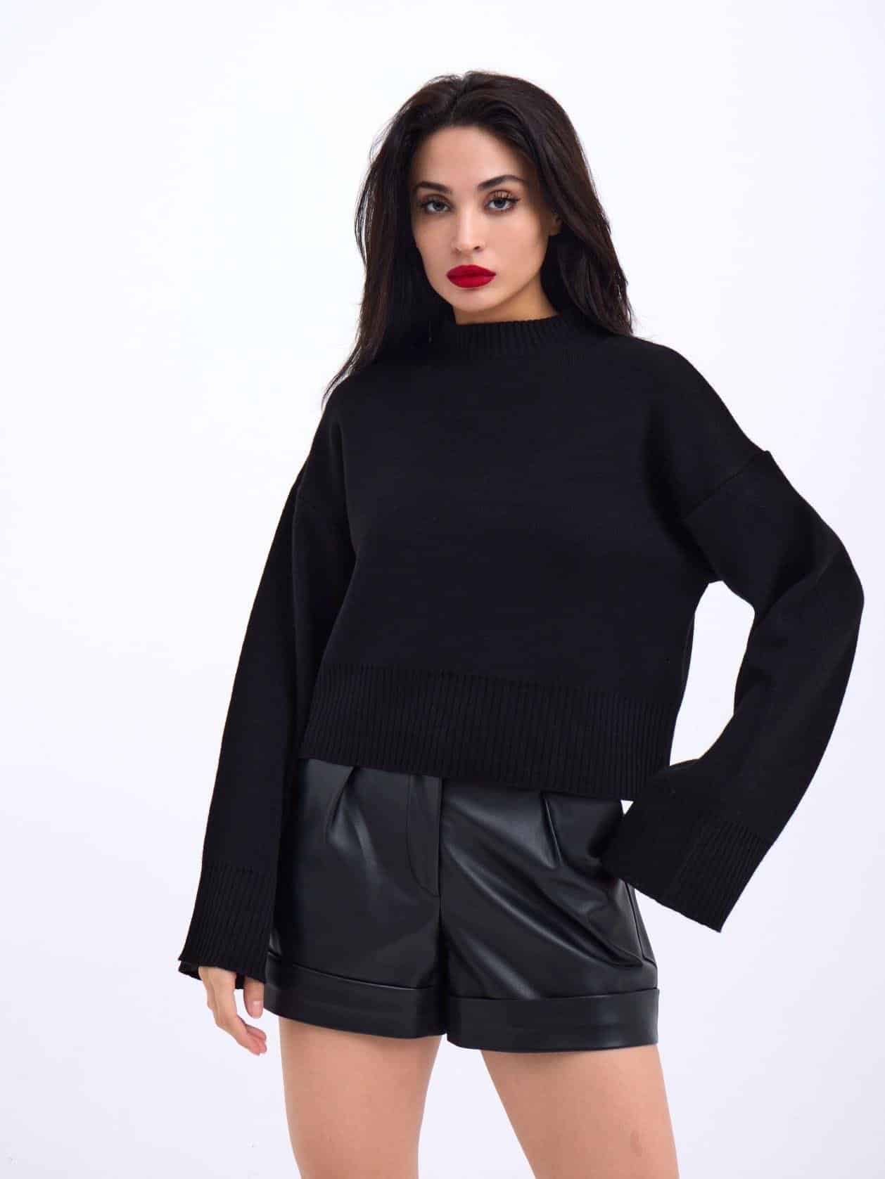 Pull noir à col rond et manches longues est à la fois décontracté et élégant.