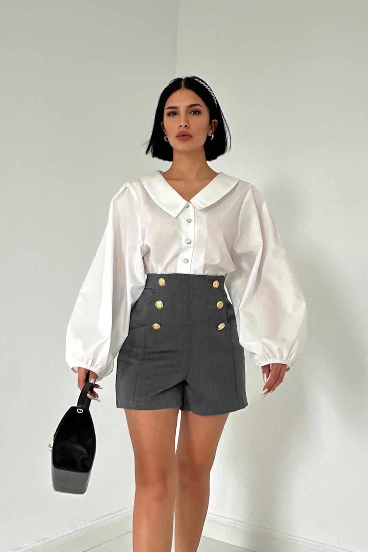 Ce short boutonné gris. Son design taille haute, ses détails dorés et sa coupe classique garantit confort et style.